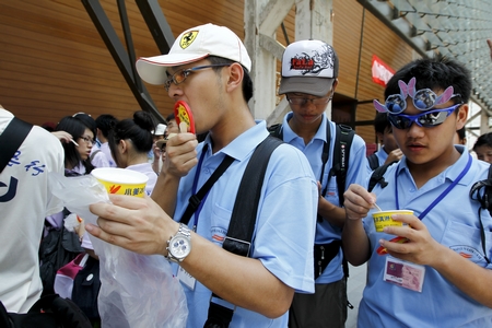 來自臺灣的青少年在臺北案例館前品嘗館方贈送的小美冰淇淋