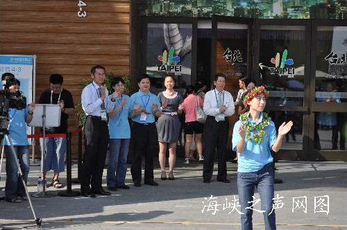 緊接著,在寶山教師放聲高歌下,以經典的臺灣老歌帶出資源回收的重要性。隨后主持人更以活潑逗趣的把垃圾帶回家的互動游戲讓游客了解臺北市民每日垃圾分類及資源回收的狀況,逗得現場民眾笑聲連連、掌聲不斷。寶山教師們更是使出拿手絕活,帶領全體共跳廣場集體舞。最后,臺北館與寶山區教育局兩地代表互贈教師節禮物,臺北館贈送致贈臺北名產鳳梨酥、臺北國際花卉博覽會的邀請卡及花博一日劵二張,及臺北館贊助單位富士康科技集團也致贈LED燈給寶山區教育局,寶山區教師也回贈寶山師生創作的“吹塑版畫”。