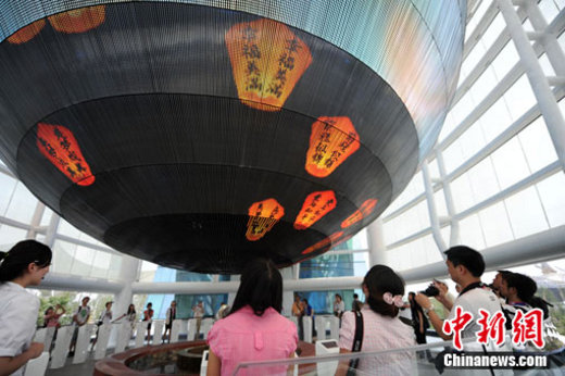 站在用臺灣日月潭的水,花蓮玫瑰石布置而成的點燈水臺前,點擊LED燈上的祈福祝語后隨著天燈冉冉升起,寓意著在上海世博會臺灣館許下的心愿會飄向全世界并實現心愿,成為游客參觀臺灣館行程中最重要的一環。圖為游客紛紛在點燈水臺前許愿祈福。 中新社發 劉柱 攝