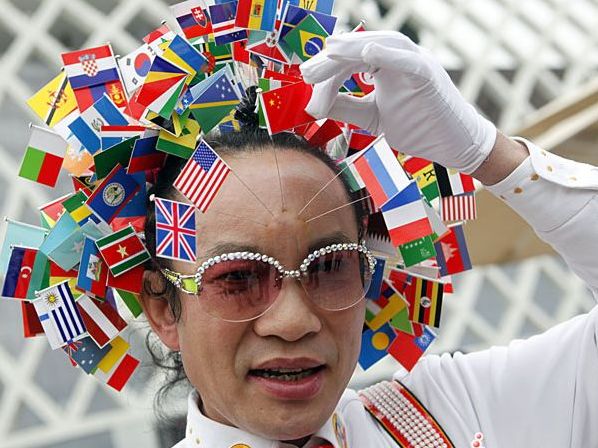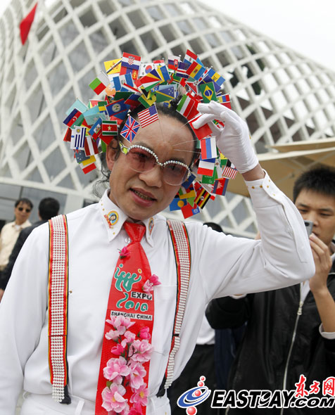 精彩紛呈的世博會,吸引了八方游客前來觀展。穿梭在展館之間的行為藝術表演,也是觀眾不容錯過的節目。更有觀眾自發上陣,支持世博,堪稱一絕。圖為有廣西人奇人之稱的韋盛初,頭上插滿世博旗幟的銀針,支持世博。(記者 劉歆/攝)