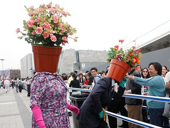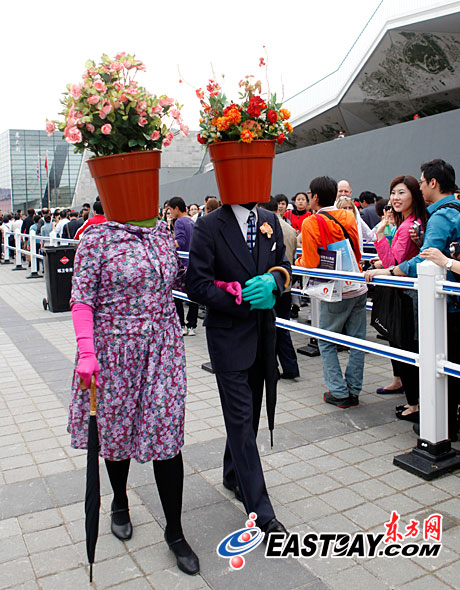 精彩紛呈的世博會,吸引了八方游客前來觀展。穿梭在展館之間的行為藝術表演,也是觀眾不容錯過的節目。更有觀眾自發上陣,支持世博,堪稱一絕。圖為在德國館前,行為藝術表演者吸引眾多觀眾駐足觀賞。(記者 劉歆/攝)