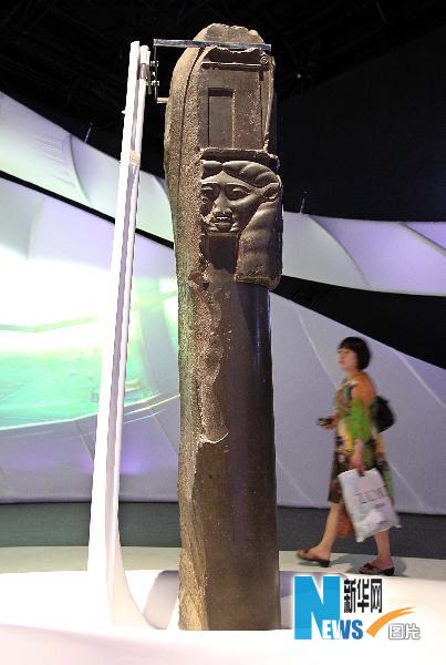 5月11日,在上海世博園埃及館,游客在參觀“刻有法老阿普里埃斯之名的愛神柱”,這件展品高達2.3米,距今已經有2500年歷史。新華社記者凡軍攝