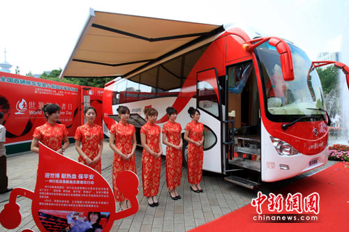 6月2日,中國內地首輛房車型愛心獻血車在上海發車啟用,并將駛入世博園區,開展愛心獻血活動。該獻血房車價值500萬元,車內寬敞,空氣清新,可營造“快樂獻血”氛圍。中新社發 潘索菲 攝