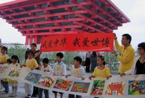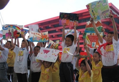 6月1日,在世博園區中軸平臺上來自海峽兩岸的小朋友紛紛用自己的彩筆描繪世博會的美好勝景,尤其是盛大花園的小朋友們的作品格外引人注目。