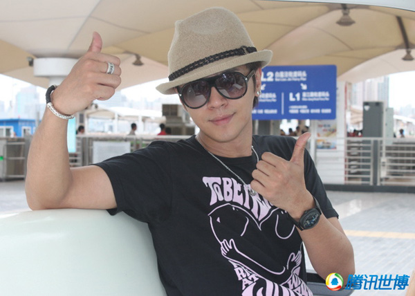 8月9日,著名藝人小豬羅志祥和助手一行來到上海世博園參觀游玩。草帽、墨鏡,雖是簡單的T恤配牛仔,但仍極有明星范兒。