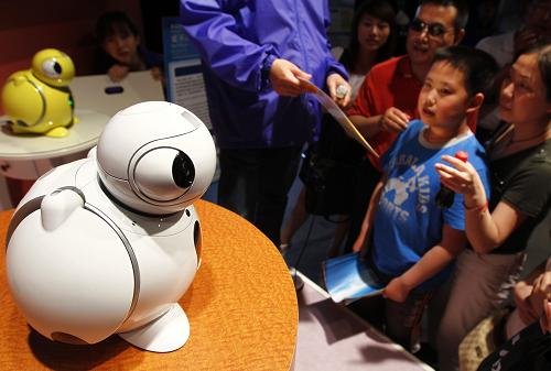 5月19日,小觀眾日本館與一臺可以與人“對話”的機器人交流互動。(新華社記者 裴鑫/攝)