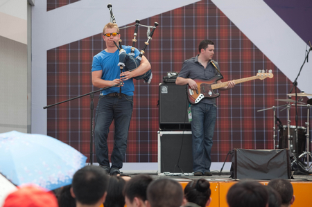 東方網7月8日消息:據《東方早報》報道,盡管在出發前遭遇風暴,行程受阻,但一路輾轉,來自蘇格蘭的斯凱里沃爾樂隊(Skerryvore)仍在昨天趕到上海,在世博園區的歐洲廣場上演了一場精彩演出,將傳統的蘇格蘭風笛、手風琴融合現代搖滾帶到世博園中,贏得了觀眾陣陣掌聲。