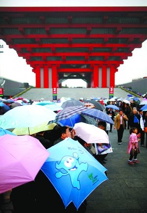 4月20日,游客雨中撐傘等待進入中國館參觀。本報記者 王申 攝