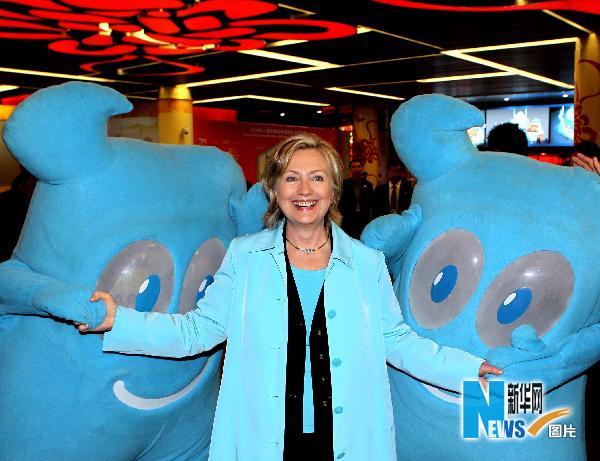 5月22日,美國(guó)國(guó)務(wù)卿希拉里·克林頓在上海世博園中國(guó)館參觀(guān)時(shí)與“海寶”親密接觸。 新華社記者張明攝