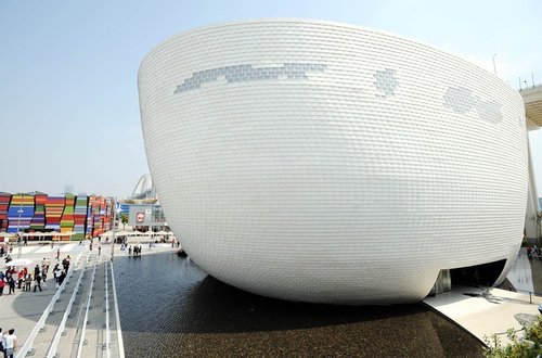 “冰壺”宛若一座水中的島嶼,外墻上覆蓋著25000片環保材料制成的鱗狀物。