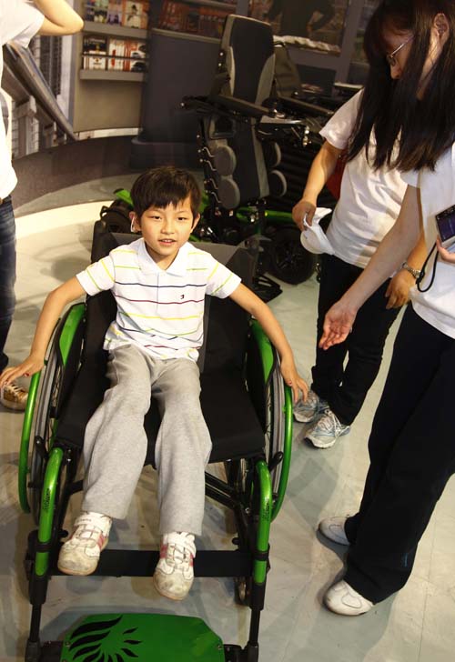 5月31日,小克梅在生命陽光館內(nèi)體驗殘疾人使用的新型輪椅。新華社記者 裴鑫 攝