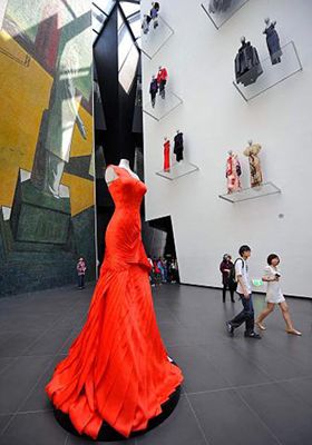 在意大利館的廣場上,杜嘉班納、范思哲、普拉達、杰尼亞設計的奢侈品服裝最招女人青睞,4個3.5米高的大型服裝模特與12個裝點墻壁上的常規模特前往往站滿了人,范思哲剪裁獨具匠心的紅裙往往吸引最多女人的目光。