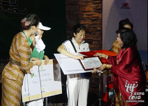 8月16日,印度尼西亞館迎來了第500萬名游客——一對來自河北的母女,母親叫張鳳英,女兒叫宋佳琦。她們也受邀參加了今天的國慶日活動,并獲贈2人“6天4夜往返上海-雅加達-巴厘”旅游大獎。此外,印度尼西亞館還特別給5018745位游客頒發了大禮包,187代表8月17日國慶日,45代表印尼于1945年建國。