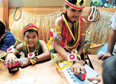 在密克羅尼西亞聯邦館內,當地的孩子們身著傳統服飾為游客敲章。