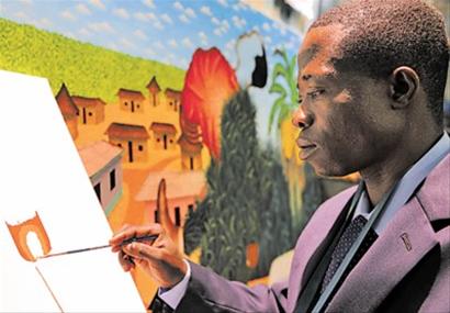 著名畫家塞納正在中非館作畫