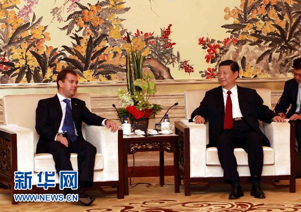 9月28日,中國(guó)國(guó)家副主席習(xí)近平在上海會(huì)見(jiàn)前來(lái)出席上海世博會(huì)俄羅斯館國(guó)家館日活動(dòng)的俄羅斯總統(tǒng)梅德韋杰夫。 新華社記者 劉衛(wèi)兵 攝