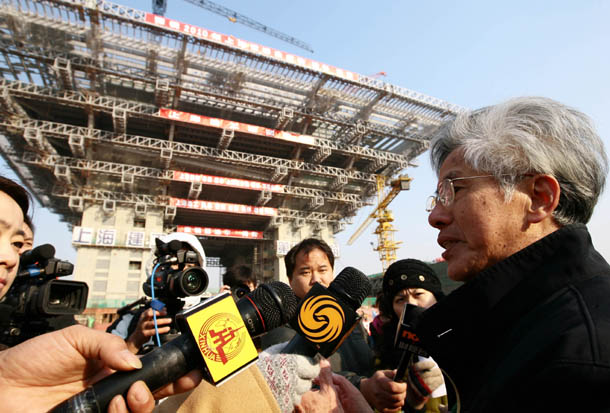 2008年12月31日,中國館鋼結構封頂。中國館設計團隊主持人何鏡堂在現(xiàn)場介紹中國館設計理念。新華社記者 任瓏 攝