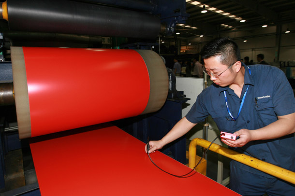 2009年5月15日,中國館墻體板生產(chǎn)線啟動,生產(chǎn)出第一卷“中國紅”鋁板。新華社記者 任瓏 攝