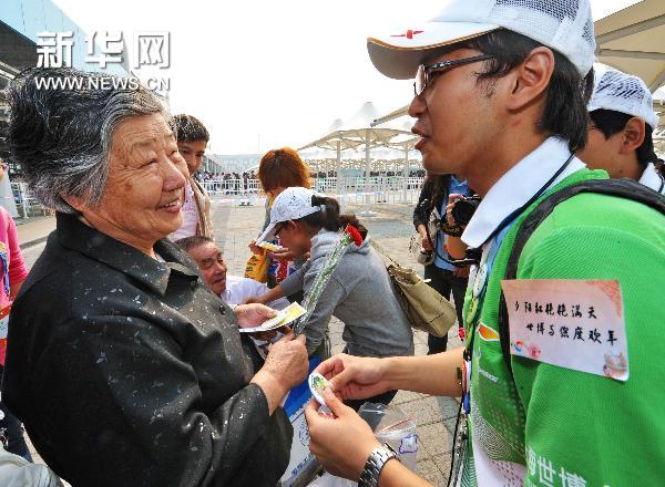 10月16日,志愿者在世博園為一位來自寧波85歲的戴桂芳老人送上鮮花和紀念徽章。新華社記者 張國俊 攝