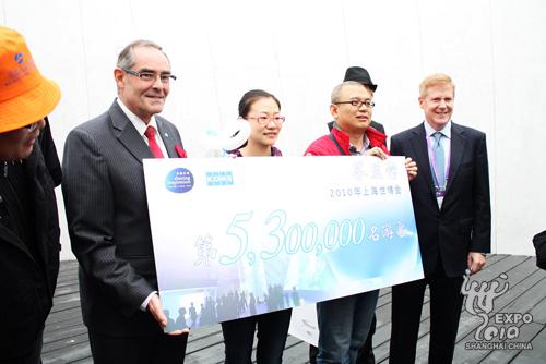 27日上午,上海世博會芬蘭館迎來了正式開館以來的第530萬名游客——來自新疆的鄭書強。芬蘭館贊助商代表為幸運游客贈送了精美大禮——豪華酒店的晚餐及住宿機會。