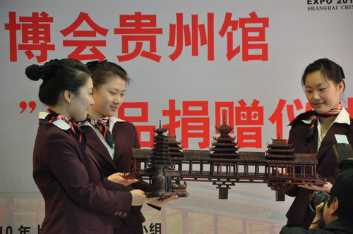 海峽之聲網上海12月23日電(記者張玉龍)今天中午,上海世博會貴州館的“侗族鼓樓”、“苗族銀飾”捐贈儀式在上海世博局舉行,代表黔東南苗侗文化元素的“鼓樓”、“銀飾”將被正在籌建中的上海世博會博物館永久保存。上海世博局副局長朱詠雷、中共黔東南州委副書記韓卉出席儀式并致辭。