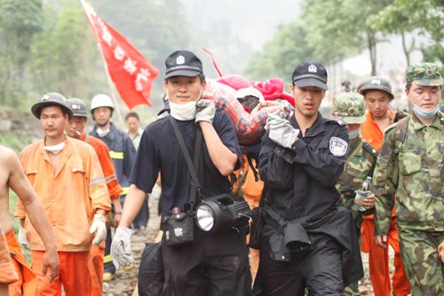 5月17日下午18時30分,深圳特警隊們扛著一名重傷男子在隨時可能發生滑坡的山路上步行了7個多小時后,終于將他送到了紅白鎮救災醫療隊。