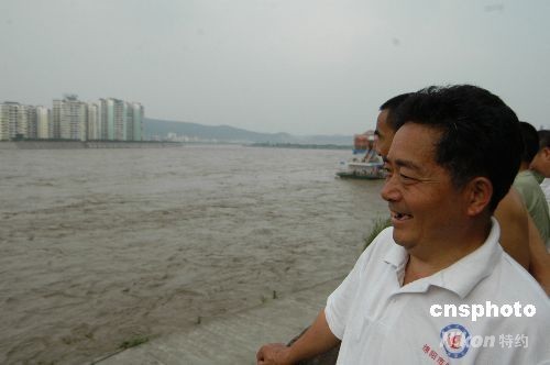 6月10日下午,唐家山堰塞湖洪水平穩通過綿陽。四川綿陽市上千市民站在涪江兩岸河堤,爭相觀看下泄洪水。地震后近一個月,這盆懸在綿陽市民頭上的堰塞湖洪水開始泄了,終于讓市民放下心。 中新社發 成和平 攝