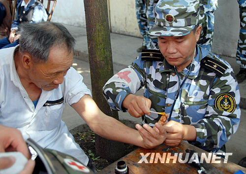 6月3日上午,在四川省什邡市師古鎮敬老院,一位軍醫為一位老人擦藥。 新華社發