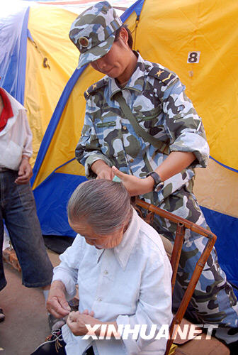 6月3日上午,在四川省什邡市師古鎮敬老院,一名女兵為一位老奶奶梳頭。 新華社發