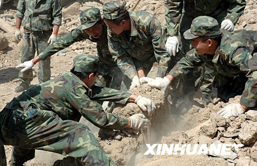 5月16日,解放軍官兵在隴南地震災區清理房屋廢墟。 新華社記者 連振祥 攝