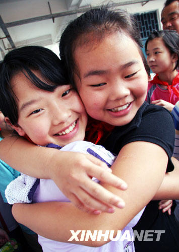 5月24日,四川都江堰市太平街小學同班同學黃緣媛(右)和王文欣,在借讀學校重慶市云陽縣實驗小學重逢,高興地擁抱在一起。新華社發(饒國君攝)