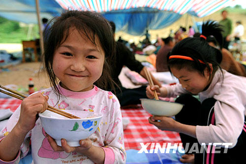 5月13日,兩名小姑娘在陜西省寧強縣青木川鎮輔仁中學安置點吃午餐。新華社記者 陶明 攝