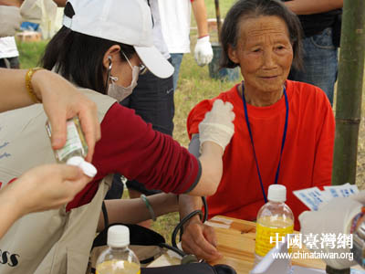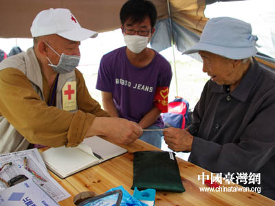 20日下午,臺(tái)灣紅十字組織醫(yī)療隊(duì)帶約3噸醫(yī)療用品等物資前往廣漢市,21日在高坪鎮(zhèn),23日在體育場(chǎng)救災(zāi)點(diǎn)設(shè)立醫(yī)療救護(hù)站,展開救護(hù)服務(wù)。救護(hù)站設(shè)有中、西醫(yī)。從21日至24日共計(jì)診治476名。對(duì)數(shù)十名老弱災(zāi)民進(jìn)行體檢,做了一臺(tái)氣胸手術(shù)、兩個(gè)骨折手術(shù)。和一個(gè)頭皮縫合小手術(shù)。內(nèi)、外科,兒科,針灸,急處方發(fā)藥點(diǎn)。巴蜀音像制作中心 蘭志泉 攝