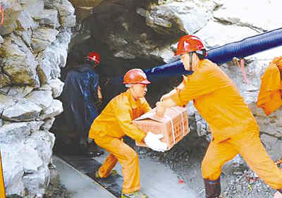 213國道線是成都至汶川縣的生命線,在“5·12”大地震中因多處山體塌方而阻斷至今。四川213國道搶修保通指揮部日前作出了對老虎嘴部分山體進行爆破的施工決定。從19日開始,施工人員在該山體內挖掘出一條約100米長的爆破洞,并填充了30余噸炸藥(見圖②)。