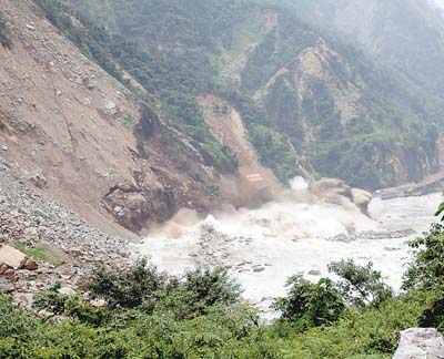 20日12時57分,隨著一聲悶響,位于四川省汶川縣映秀鎮岷江上游2公里處的老虎嘴部分山體頃刻坍塌,將淹沒213國道的岷江左側水流封堵,并一次整體成型了上百米的路基(見圖①,唐俊鋒攝)。
