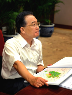 8月5日,中共中央政治局常委、國務院總理、國務院抗震救災總指揮部總指揮溫家寶在北京中南海主持召開總指揮部第24次會議,討論汶川地震災后恢復重建總體規劃。這是溫家寶在觀看《國家汶川地震災后恢復重建總體規劃圖集(初稿)》。(新華社記者劉建生攝)