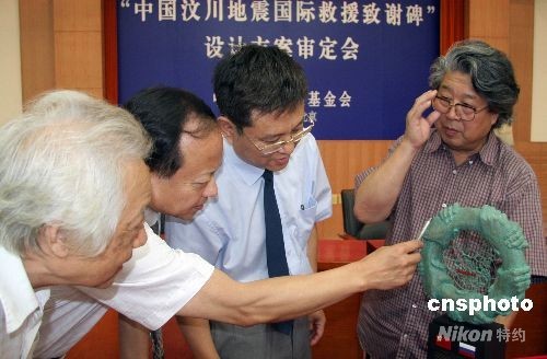 致謝碑以五雙相握的手支撐起的青銅圓環為主體造型,寓意世界五大洲心手相連、共抗災難。圖為領銜設計者、中國雕塑學會名譽會長曹春生教授(右一)同與會者一起研討、交流致謝碑模型。中新社發 孫自法 攝