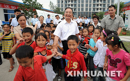 9月2日,溫家寶來到都江堰新建小學過渡板房學校看望孩子們時,孩子們簇擁在總理身邊。