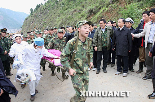 資料圖片:5月14日,國(guó)務(wù)院總理溫家寶抵達(dá)地震重災(zāi)區(qū)四川北川縣察看災(zāi)情。這是溫家寶在距北川縣縣城僅兩公里的曲山鎮(zhèn)察看災(zāi)情時(shí),幾名戰(zhàn)士抬著小女孩宋馨懿從縣城方向跑過(guò)來(lái),溫家寶和隨行人員趕緊讓路。溫家寶說(shuō),時(shí)間就是生命,要盡全力救人。 新華社記者姚大偉攝