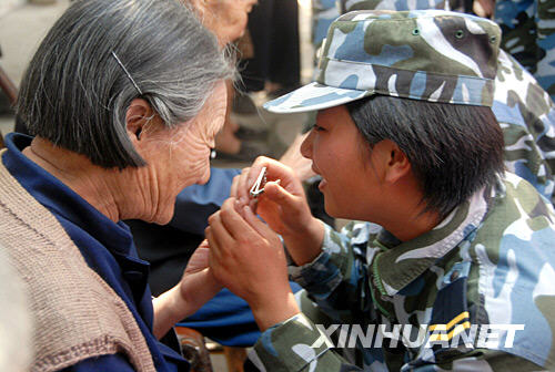 6月3日上午,在四川省什邡市師古鎮敬老院,一名女兵為一位老奶奶梳頭。 新華社發