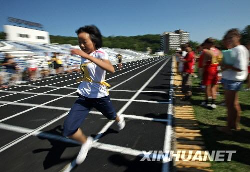 8月3日,在俄羅斯南部黑海之濱圖阿普謝的“小鷹”全俄兒童中心,正在這里療養的四川地震災區學生(左二)與俄羅斯學生一起參加百米跑比賽。當日,“小鷹”全俄兒童中心舉行運動會,中俄學生同場競技,一展風采。新華社記者沈伯韓攝