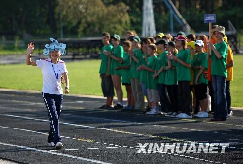 8月3日,在俄羅斯南部黑海之濱圖阿普謝的“小鷹”全俄兒童中心,一名正在這里療養的四川地震災區學生與俄羅斯學生一起參加4×100米接力賽。當日,“小鷹”全俄兒童中心舉行運動會,中俄學生同場競技,一展風采。新華社記者沈伯韓攝