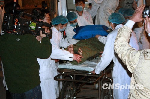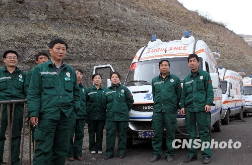 4月5日凌晨1時23分,首名王家嶺煤礦被困礦工由晉煤集團總醫院急救車送至山西鋁廠職工醫院救治。擔任首車救護任務的閆大夫介紹,被救礦工叫靳群紅,36歲。閆大夫說,靳被救出來時血壓正常,神志清醒。他同靳在路上談話時,靳說近兩天已快站不起來了。據悉,當日凌晨2時10分,第9名礦工已送至山西鋁廠職工醫院救治。 中新社發 王衛平 攝
