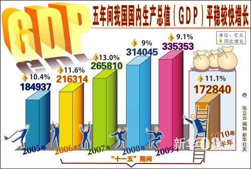 新華社圖表,北京,2010年10月11日圖表:五年間我國國內生產總值(GDP)平穩較快增長新華社發