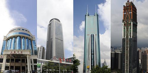30年來(lái)深圳的地標(biāo)建筑越來(lái)越高,從改革開放初期的上海賓館,到80年代的國(guó)貿(mào)大廈,90年代的地王大廈,很快將迎來(lái)京基金融中心的新高度(從左至右,拼接圖片)。