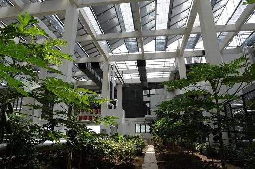 建科大樓頂層是蔬菜園,上面架空的是太陽(yáng)能光板(8月18日攝)。