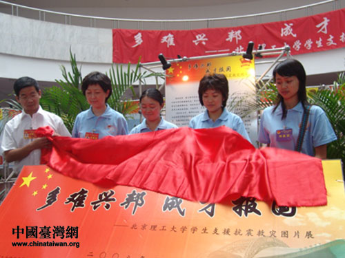座談會后,幾位代表為北京理工大學抗震救災(zāi)圖片展揭幕(攝影:鐘寶華)