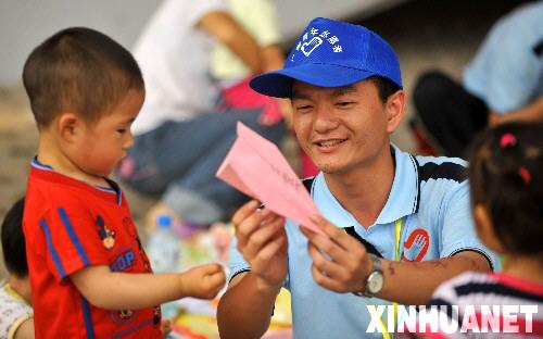 5月28日,一名來(lái)自廣西的青年志愿者在綿陽(yáng)九洲體育館外與孩子做游戲。 在四川綿陽(yáng)九洲體育館受災(zāi)群眾安置點(diǎn),來(lái)自全國(guó)各地的100多名志愿者經(jīng)常陪伴在災(zāi)區(qū)兒童身旁,通過(guò)繪畫(huà)、游戲等心理援助手段,使孩子們幼小的心靈能夠盡快擺脫災(zāi)難的陰影。 新華社記者 郝同前攝
