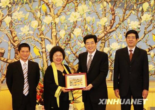 5月21日,陳菊向郭金龍贈送禮品。當日,北京市市長郭金龍在北京飯店會見高雄市市長陳菊及高雄世運觀光行銷團一行。新華社記者 邢廣利 攝