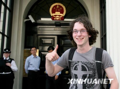 7月27日,在倫敦,英國青年艾薩克·劉易斯走向中國駐英大使館。當天,劉易斯結束了為中國四川地震災區進行的240英里(約386公里)的徒步募捐活動,抵達中國駐英大使館。他6月7日從北威爾士的家鄉出發,目標是募集3000英鎊(約合6000美元)善款,目前已募集到2500英鎊。 新華社記者謝秀棟攝
